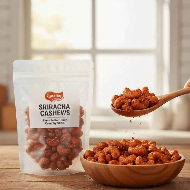 ZestBites Sriracha Cashews—fiery roasted cashews with bold sriracha flavor, rich in protein and crunch.