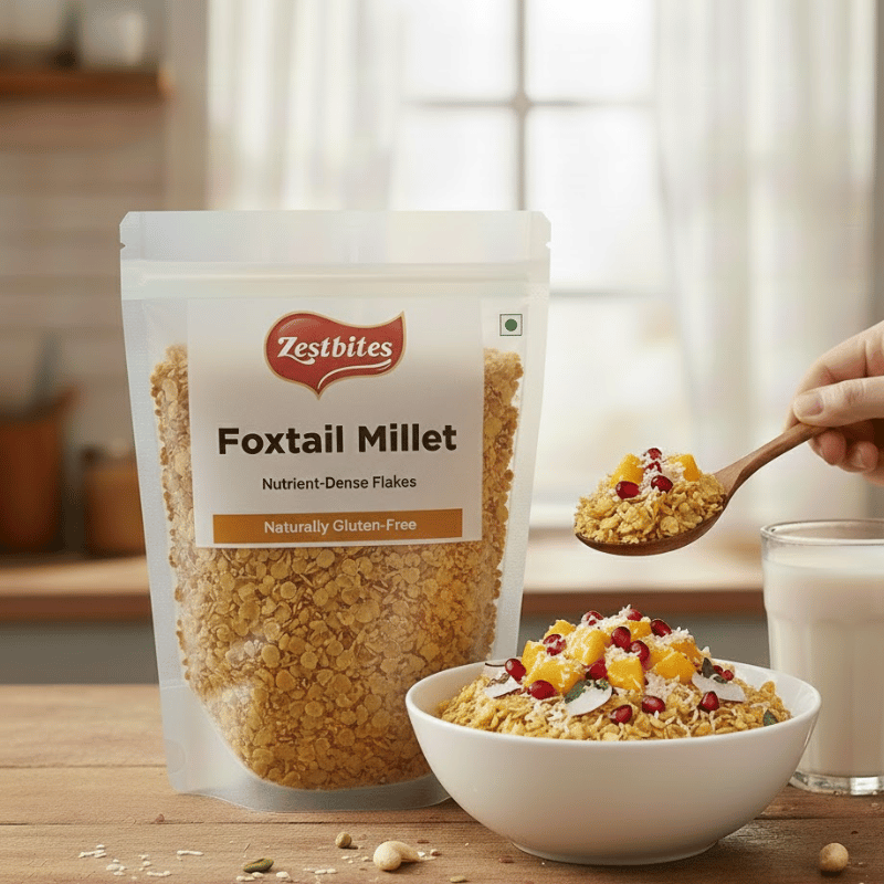 ZestBites Foxtail Millet Flakes—light, crunchy, and wholesome. Packed with fiber, protein, iron, and antioxidants, they support digestion, energy, and overall wellness for a healthy start to your day.