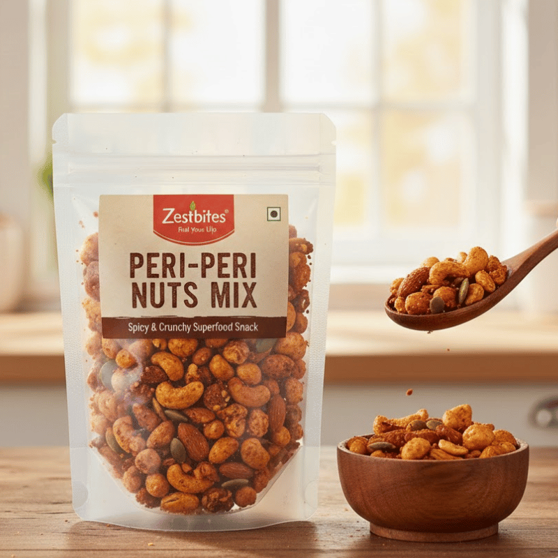 Ignite your taste buds with ZestBites Peri Peri Nuts Mix, a bold and crunchy snack crafted for spice lovers. This mix combines premium almonds, cashews, and peanuts with zesty peri‑peri seasoning to deliver irresistible flavor and wholesome nutrition.
